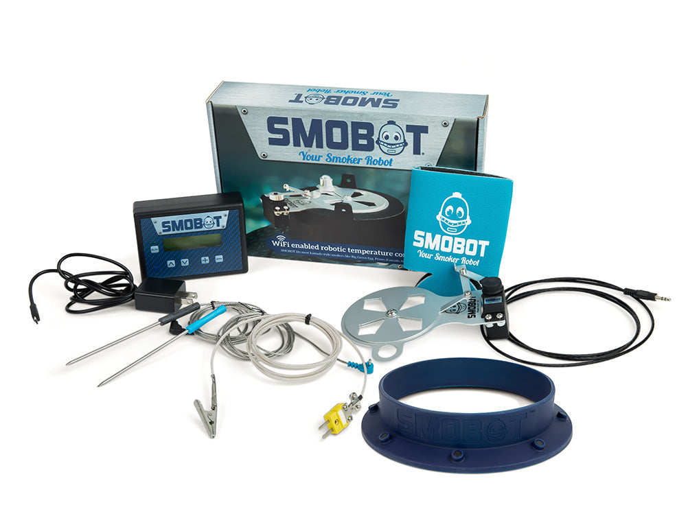 SMOBOT is a patented robotic damper system that attaches over the top vent of your Weber Smokey Mountain, utilizing our high temperature silicone mounting gasket and magnets. SMOBOT monitors the temperature inside the smoker using a high temperature thermocouple. When the temperature varies from the target you set, the controller tells the damper how much to open and close to maintain the temperature you choose. Think of SMOBOT as your smoker robot.
